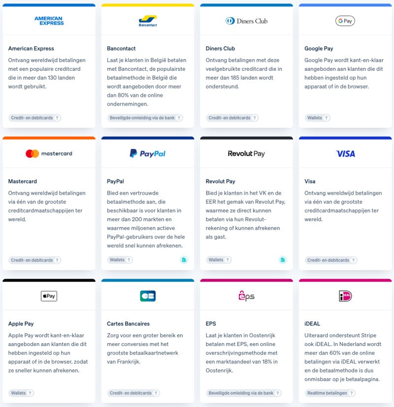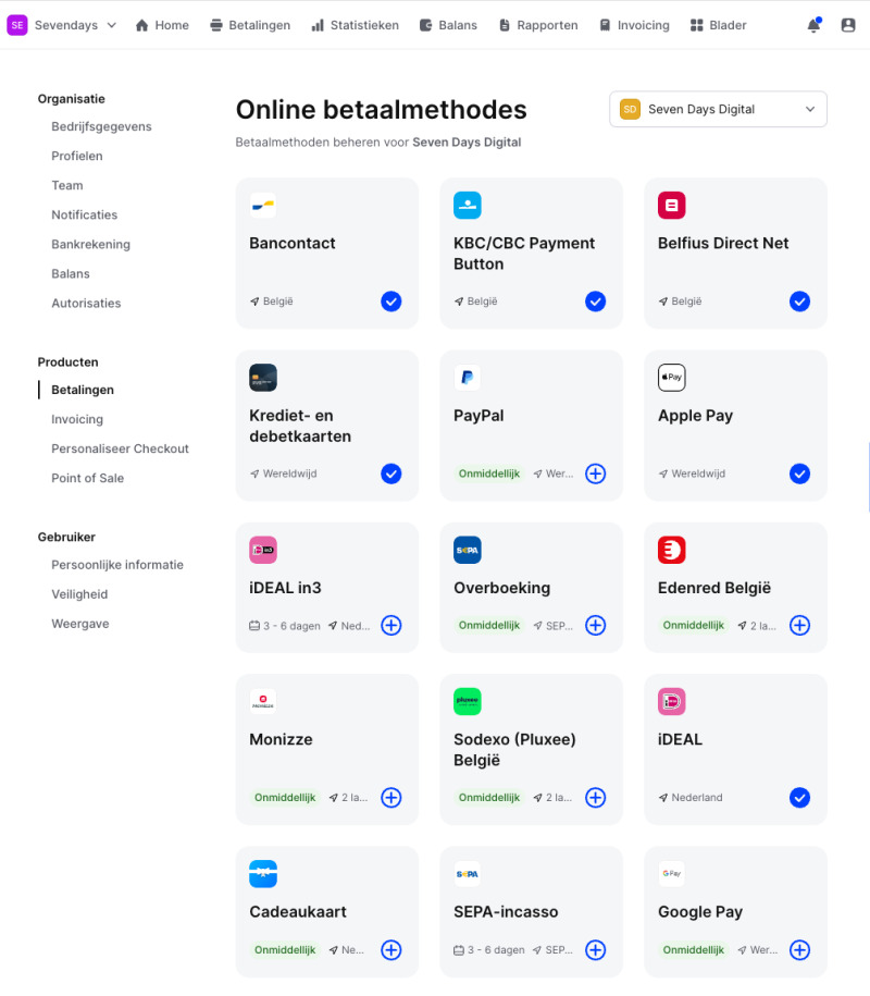 Mollie: Strongly focuses on European, local payment methods. In addition to the well-known international payment options such as credit cards, Apple Pay, PayPal, etc., in Belgium you also have integration with local banking apps such as KBC and Belfius, as well as support for Eco and meal vouchers from Edenred or Sodexo (Pluxee).