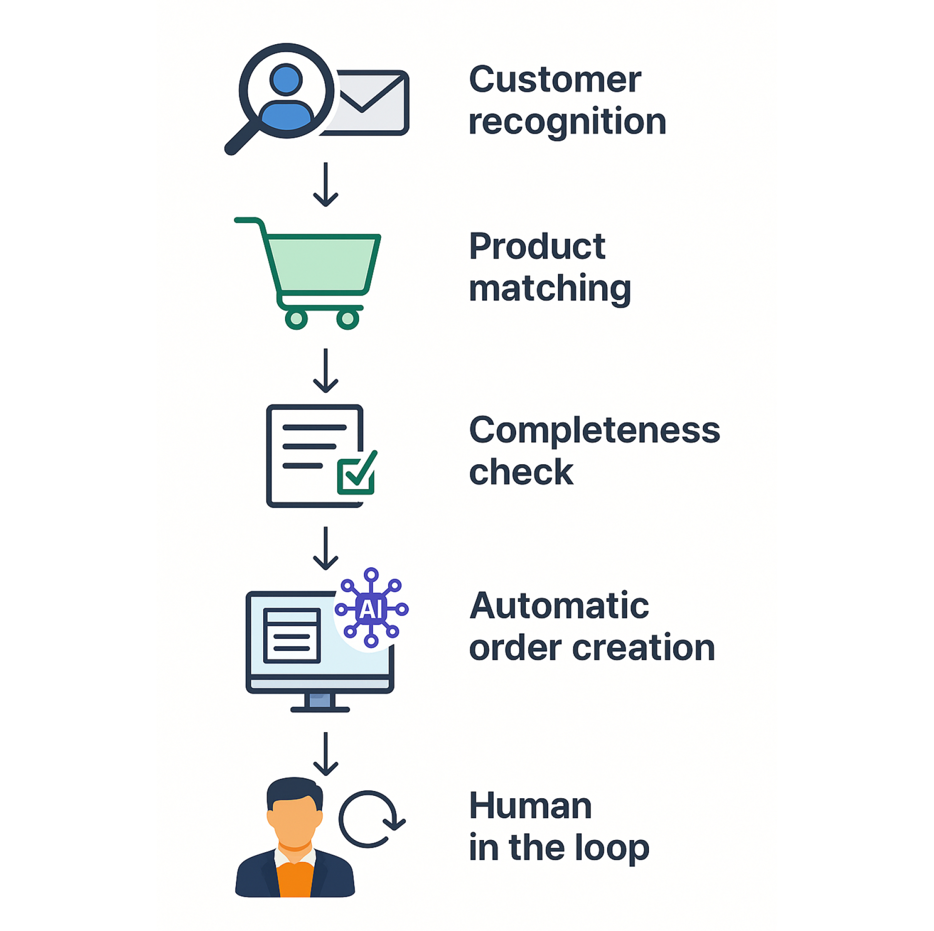 Human in the loop: Indien gewenst wordt het order als concept aangemaakt en volgt er eerst nog een manuele goedkeuring door een medewerker.