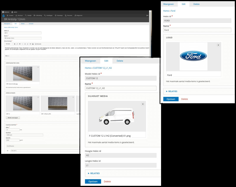 Zo kan een Hebic beheerder producten die instromen vanuit het ERP, verder verrijken in het CMS met een afbeelding, omschrijving (in meerdere talen) en een categorie toewijzen. De geleverde inspanningen om het product te verrijken renderen dan dubbel: enerzijds om op de website te tonen en anderzijds om in de configurator applicatie te tonen.